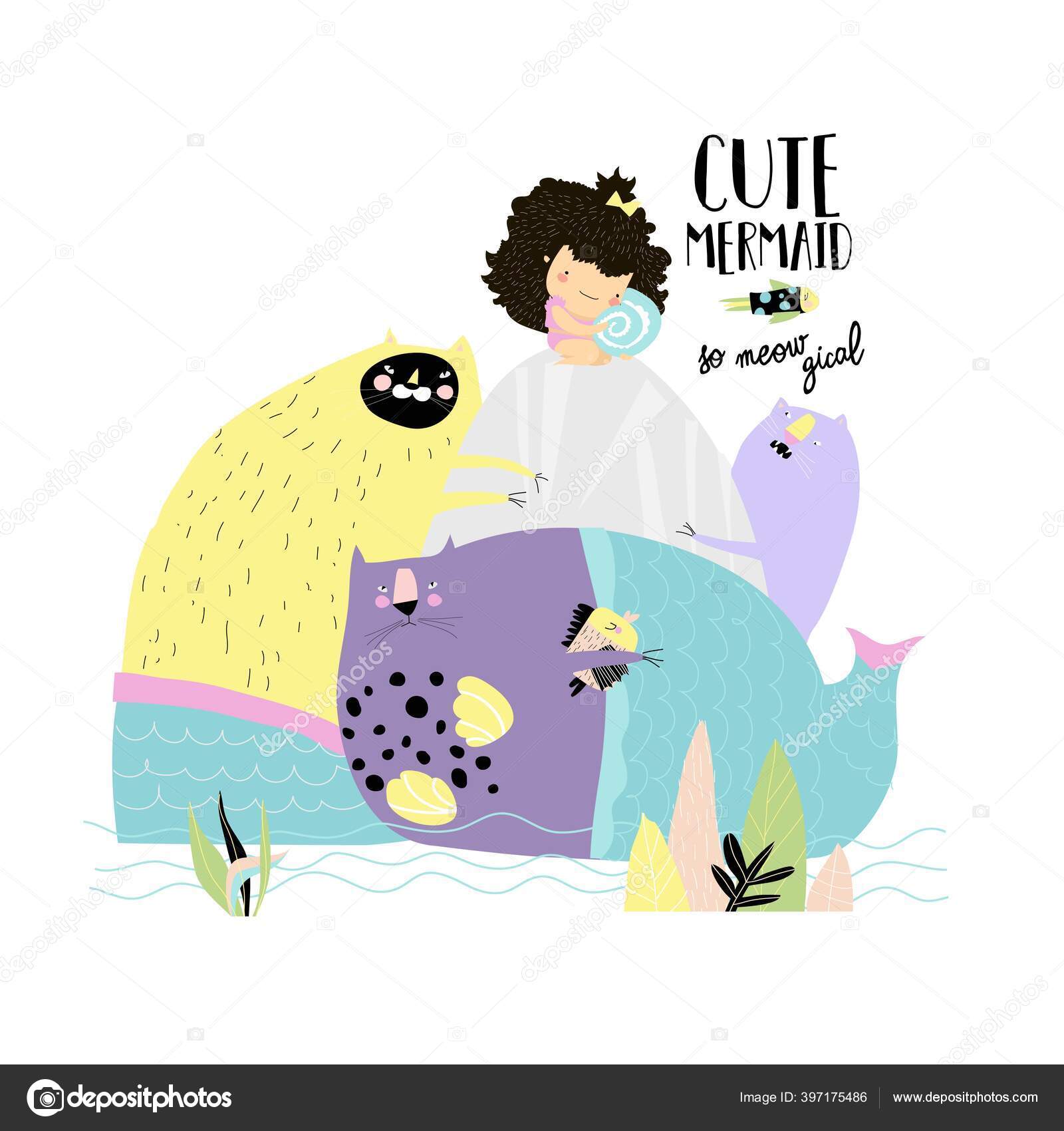 Gato De Sirena De Dibujos Animados Lindo Bajo El Mar Ilustracion Gracioso Vector Ilustraciones Vectoriales Clip Art Vectorizado Libre De Derechos Image 81800491